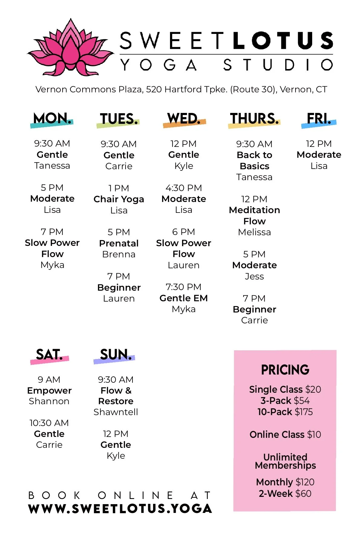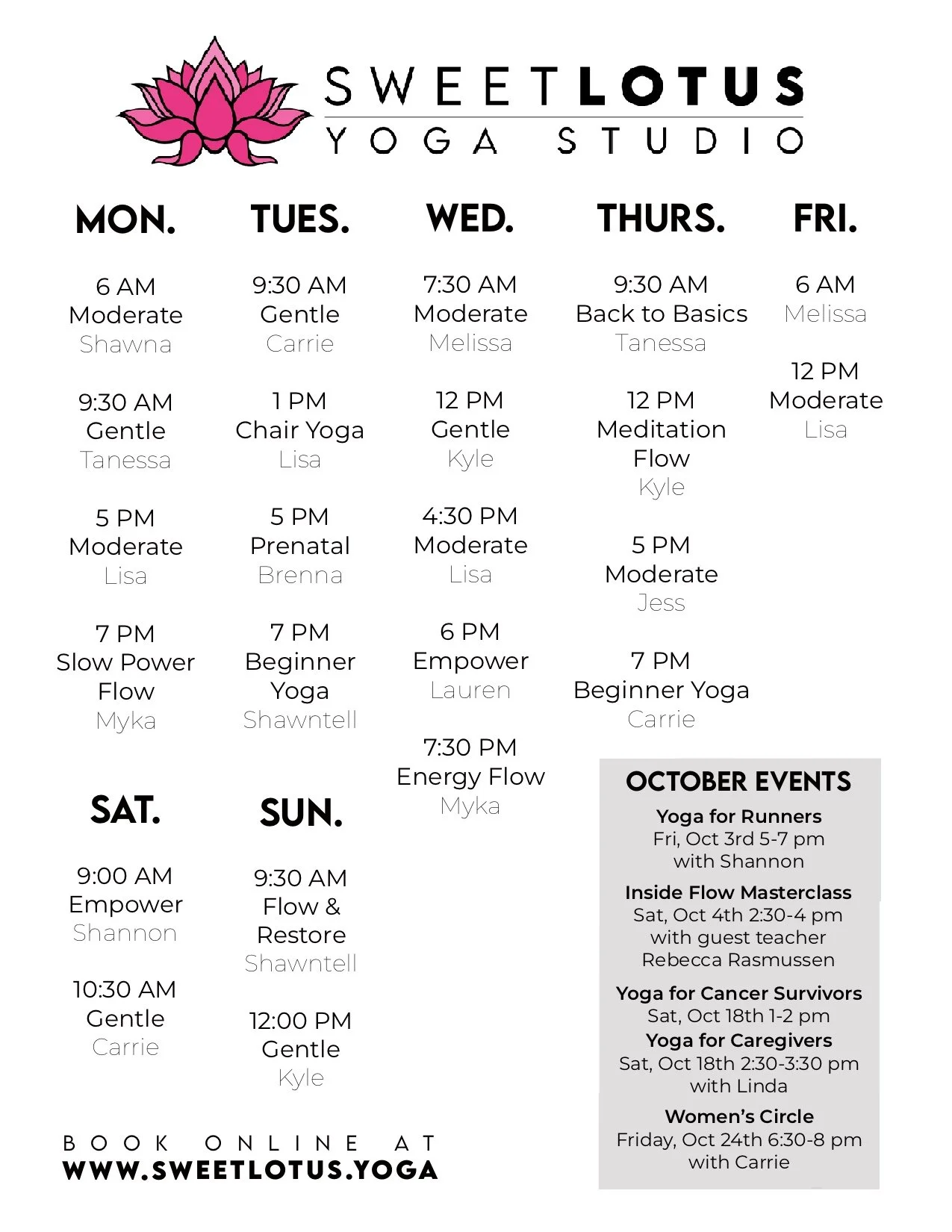 We love to share new and fun ideas and practices with you at Sweet Lotus! Each month we offer new workshops (longer-form, 90 to 120-minute, more intense lessons and events) and special classes (new twists on familiar practices that tend to run 60 to 75 minutes long).